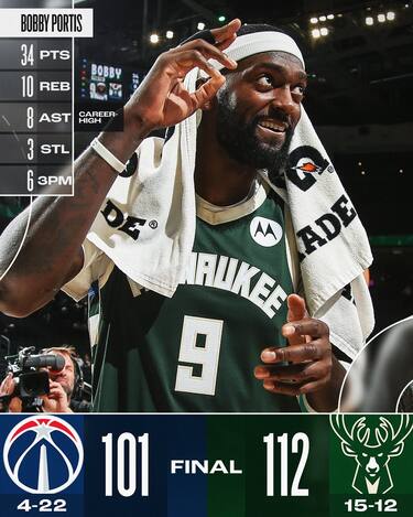 È un ottimo Bobby Portis, partito in quintetto al posto dell’assente Giannis Antetokounmpo, a fare da trascinatore per i Bucks nella vittoria su Washington. Il veterano sfiora la tripla doppia con 34 punti, 10 rimbalzi e 8 assist, Khris Middleton aggiunge 18 punti e 8 assist e per gli Wizards c’è davvero poco da fare. Gli ospiti non riescono infatti a capitalizzare sulla buona serata di Jordan Poole (26 punti e 8/13 da tre) e su un Bilal Coulibaly sempre più protagonista e autore di una prova da 20 punti, 12 rimbalzi e 5 assist