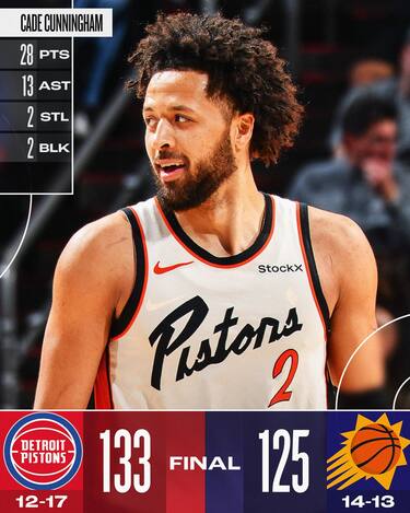 La sorpresa della nottata la regalano i Pistons, che trascinati da un Cade Cunningham da 28 punti e 13 assist partono fortissimo e poi riescono a contenere i tentativi di rimonta da parte di Phoenix. Detroit manda ben 7 giocatori in doppia cifra e si gode un Jalen Duren da 17 punti e 11 rimbalzi che spadroneggia a lungo nel pitturato. Bradley Beal, chiamato a fare le veci dell’assente Devin Booker, chiude con 26 punti e 5 assist, ma è in difesa che i Suns, concedendo agli avversari il 55.1% dal campo e il 48.7% da tre, segnano la loro condanna