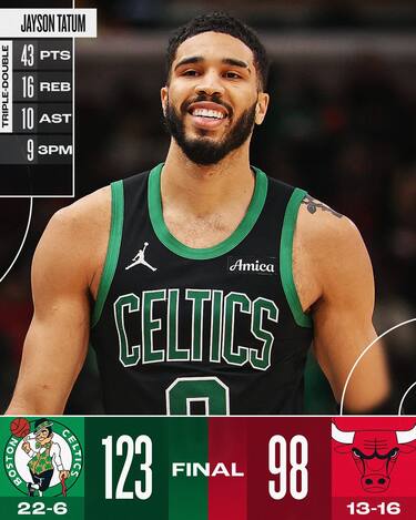 Nella facile vittoria dei Celtics allo United Center di Chicago c’è un solo, grande protagonista: Jayson Tatum. La stella di Boston gioca una gara a dir poco dominante e, in meno di 36 minuti trascorsi sul campo, mette a segno la sua terza tripla doppia in carriera con 43 punti, 15 rimbalzi e 10 assist che annichiliscono i Bulls