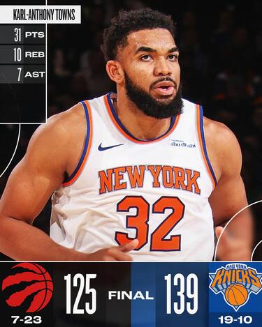 Ai Knicks basta accelerare nel 2° quarto per battere i Raptors, che da lì in poi non riescono più a impensierire i padroni di casa. Karl-Anthony Towns (31 punti, 10 rimbalzi e 7 assist) e OG Anunoby (31 punti con 13/15 dal campo) sono i trascinatori per New York, che dalla panchina pesca anche un Cam Payne da 19 punti in poco più di 15 minuti giocati. Per Toronto, arrivata all’8° sconfitta consecutiva, le uniche note positive arrivano dai soliti Scottie Barnes e RJ Barrett, autori rispettivamente di 24 e 23 punti