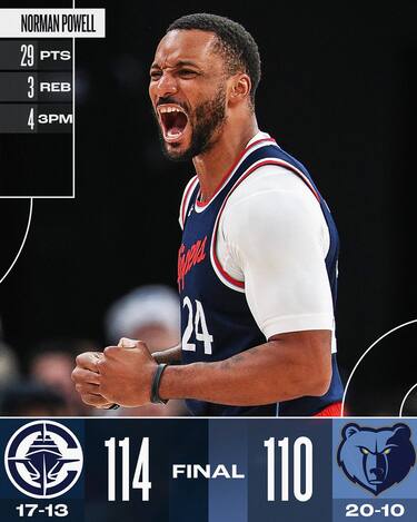 È Norman Powell (29 punti) a decidere la sfida tra Grizzlies e Clippers, segnando gli ultimi 4 punti della gara con un jumper dalla media e dalla lunetta e regalando così ai suoi una preziosissima vittoria in trasferta. I Clippers trovano anche la doppia doppia da 20 punti e 19 rimbalzi di un Ivica Zubac a tratti dominante nel pitturato, mentre Memphis ha 24 punti da Jaren Jackson Jr. e 23 da Ja Morant, ma finisce per pagare le 20 palle perse e l’imprecisione al tiro nelle ultime battute del 4° quarto