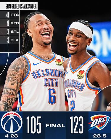 8° vittoria consecutiva in regular season per i Thunder, che dopo aver giochicchiato con gli Wizards per i primi tre quarti piazzano un parziale di 19-3 a inizio del 4° quarto e mettono le mani sulla partita. Washington fa intravedere cose discrete da Jordan Poole, autore di 31 punti con 9/20 dal campo, ma dall’altra parte Isaiah Hartenstein va di nuovo in doppia doppia con 16 punti e 11 rimbalzi e il rookie Ajay Mitchell che lo imita uscendo dalla panchina e chiudendo con 16 punti e 12 rimbalzi