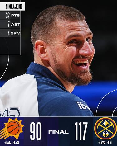 La sfida balcanica con Jusuf Nurkic non è esattamente tra le più esaltanti, e Nikola Jokic, pur giocando con le marce basse, domina i Suns e chiude con 32 punti tirando 12/17 dal campo e smazzando anche 7 assist ai compagni