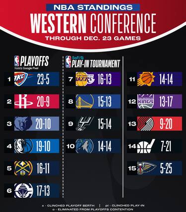 Oklahoma City vince l'8° partita di fila ed è sempre più prima a Ovest, le sconfitte interne costano a Lakers e Warriors lo scivolamento in zona play-in. Phoenix, sconfitta a Denver, al momento è addirittura 11° nella Western Conference e quindi fuori dai giochi