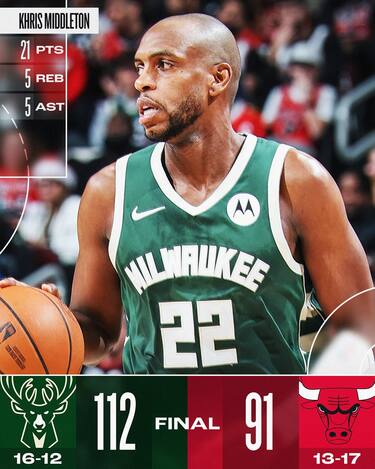 Continua l’eccellente periodo vissuto dai Bucks, che senza le loro due stelle Giannis Antetokounmpo e Damian Lillarddominano dall’inizio alla fine in trasferta a Chicago. Khris Middleton (21 punti e 5 assist) e Bobby Portis (19 punti, 13 rimbalzi e 6 assist) fanno la voce grossa da subito e non lasciano grandi margini di recupero ai Bulls, tra le cui fila si salva forse il solo Nikola Vucevic, autore dalla consueta doppia doppia da 17 punti e 12 rimbalzi che però incide ben poco sull’andamento della partita
