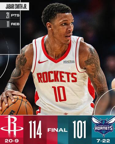I Rockets, nella trasferta di Charlotte, mettono subito in chiaro le cose già dal 1° quarto, dove concedono ai padroni di casa 15 punti che saranno 31 all’intervallo lungo, chiudendo così di fatto la gara già nel primo tempo. Jabari Smith Jr.(21 punti e 11 rimbalzi) è il migliore per Houston, che trova anche 17 punti in uscita dalla panchina da Cam Whitmore. Agli Hornets non bastano i 24 punti e 8 rimbalzi di Miles Bridges e i 23 punti e 8 assist di LaMelo Ball, anche perché buona parte della loro produzione arriva quando la partita è già ampiamente decisa