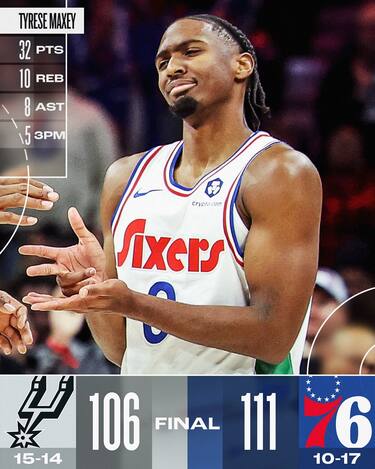 Joel Embiid (9 punti e 3 rimbalzi), alla seconda partita dopo il suo rientro, si fa espellere alla fine del 2° quarto, ma Philadelphia riesce comunque a battere gli Spurs. San Antonio, che ha 26 punti, 9 rimbalzi e 8 stoppate dal solito Victor Wembanyama, è avanti 102-101 a 1:20 dalla fine, ma sul finale subisce la rimonta dei padroni di casa, forti delle prestazioni di Paul George (19 punti e 9 rimbalzi) e di un ottimo Guerschon Yabusele, autore di 17 punti in uscita dalla panchina
