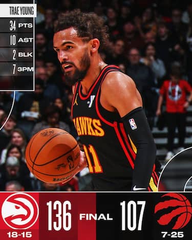 Nell’ottimo momento vissuto da Atlanta, protagonista di una prima parte di stagione decisamente al di sopra delle aspettative, c’è soprattutto la firma di Trae Young, che anche nella trasferta di Toronto si conferma più che mai leader della squadra. Per lui ci sono 34 punti e 10 assist, ma c’è soprattutto il 7/13 da tre che affonda i Raptors lanciando gli Hawks verso le zone alte della classifica della Eastern Conference