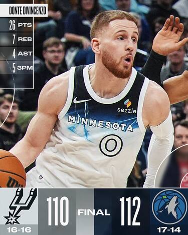 La tripla del possibile sorpasso sulla sirena, presa da Jeremy Sochan, non tocca nemmeno il ferro e a vincere una partita in cui le due squadre sono state protagoniste di continui parziali e controparziali sono i Timberwolves padroni di casa. Minnesota trova un eccellente Donte DiVincenzo in uscita dalla panchina, che guida i suoi con 26 punti, 7 rimbalzi e 4 assist tirando 5/10 da tre, mentre agli Spurs non bastano un Harrison Barnes da 24 punti con 8/9 dal campo e un Devin Vassell da 22 punti e 7 rimbalzi