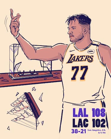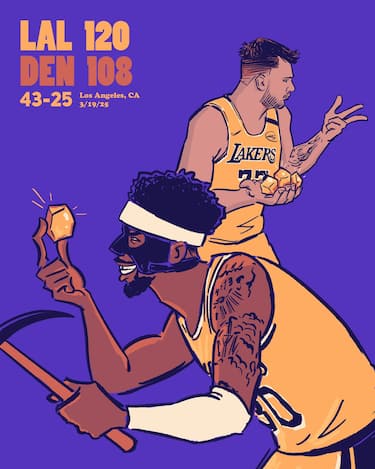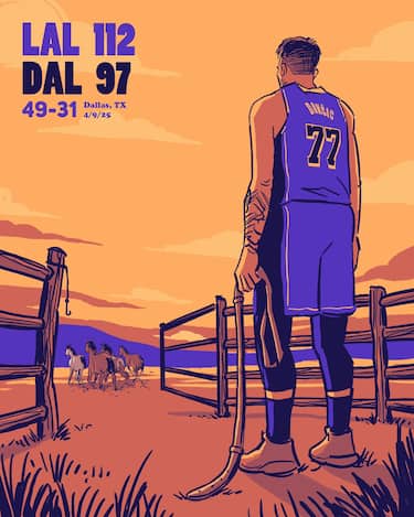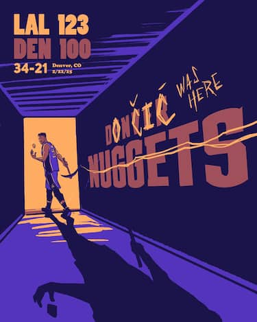 - È tutta per Doncic invece l'illustrazione per il successo in casa dei Denver Nuggets. Lo sloveno tiene una pepita d'oro in una mano (dal simbolo dei Nuggets, letteralmente le pepite) e un piccone nell'altra (altro simbolo della squadra del Colorado e della corsa all'oro), cancellando la scritta sul muro e scrivendo "DONCIC WAS HERE", Doncic è stato qui. Strepitoso l'auto-riferimento: se scorrete questa gallery, alla 16^ gara stagionale troverete il corrispettivo di questa illustrazione ma al contrario, con Nikola Jokic vincente a Los Angeles