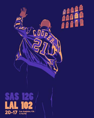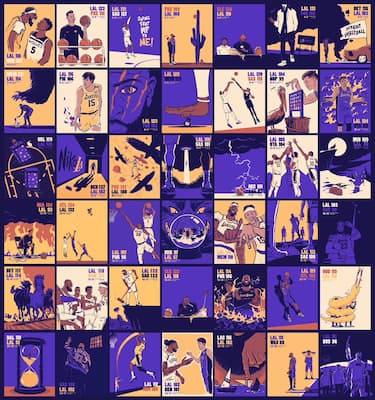 Un lavoro monumentale quello di Jack Perkins: 82 illustrazioni, una per ogni partita dei Lakers, utilizzando sempre e soltanto una palette di colori che al gialloviola al massimo ha aggiunto del bianco e del nero. E allora il lavoro di quasi sei mesi alla fine diventa (anche) un'opera unica, un poster che si può acquistare a questo link dove l'illustratore losangelino mette in mostra le sue opere