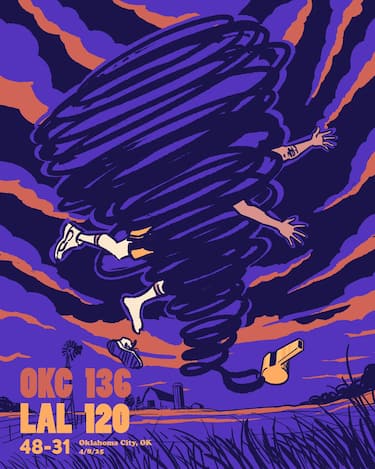- Sembra un normale tornado quello disegnato da Jack Perkins per illustrare la "rivincita" presa dai Thunder sui Lakers a 24 ore dal ko subìto in casa (normale per la prassi di questa regione degli USA, abituata a eventi climatici abbastanza estremi). Ma se si guarda meglio l'illustrazione, si vede che a formare il tornado è il filo che ha al suo estremo il fischietto arbitrale, perché a decidere la partita è l'espulsione di Luka Doncic con 7:40 da giocare nel 4° quarto e i Lakers sopra di un punto sul 108-107. Da lì in avanti, parziale di 29-12 per OKC e partita che ha un solo padrone: i Thunder