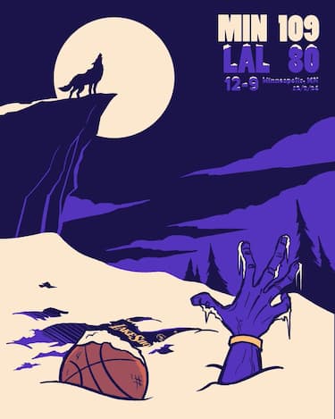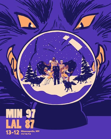 - I gialloviola si presentano a Minneapolis senza LeBron James e finiscono nelle fauci dei TWolves, che nell'illustrazione circondano coach JJ Redick e gli altri membri dei Lakers come un branco all'interno di una palla di vetro, visto che comunque si avvicinano le feste natalizie. Un maxi lupo in versione "Volpe a nove code" di Naruto sorveglia incombendo da dietro