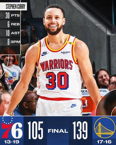 Pur avendo segnato quasi 4.000 triple in carriera, Steph Curry non aveva mai vissuto una serata da 8/8 da tre punti come quella vissuta stanotte contro Philadelphia. A fine serata sono 30 i suoi punti con 10 assist a referto, realizzati in meno di 30 minuti assolutamente irreali per precisione al tiro. La sua 85^ partita con almeno 8 triple a segno (Damian Lillard, secondo, si ferma a 31) non ha precedenti, visto che al massimo era arrivato all’85% di realizzazione (11/13 nel 2013), ma mai al 100% con così tanti tentativi