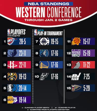Questa la classifica della Western Conference: OKC continua a dominare, portando a 5.5 gare il suo vantaggio su Memphis seconda. I Lakers approfittano delle sconfitte di Clippers e T'Wolves per salire al sesto posto, a sola mezza gara dal quinto occupato da Dallas in difficoltà. Golden State torna sopra il 50% di vittorie, Portland sempre più fuori dai giochi