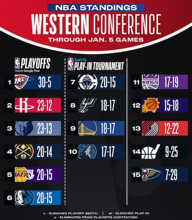 Le vittoire di Thunder e Rockets su Celtics e Lakers ne rinsaldano le posizioni in cima alla classifica della Western Conference, con il successo a Golden State, il 4° di fila, i Kings si riavvicinano alla zona play-in a Ovest
