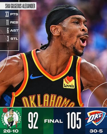A guidare OKC è ancora una volta uno straordinario Shai Gilgeous-Alexander: 33 punti, 11 rimbalzi, 6 assist, 3 recuperi e 2 stoppate per il candidato MVP, assolutamente trascinante con 11/23 al tiro e 8/8 ai liberi nonostante la difesa dei Celtics concentrata il più possibile ad arginarlo. Pur in una serata non eccezionale di Jalen Williams (10 punti e 3/10 al tiro), i Thunder nel quarto periodo hanno trovato tre triple da parte di Luguentz Dort, cuore e anima difensiva della squadra che con 14 punti ha fatto la differenza, insieme ai 13 di Cason Wallace e i 15 preziosissimi dalla panchina di Aaron Wiggins per rimanere a contatto anche quando i Celtics sembravano aver messo le mani sulla partita