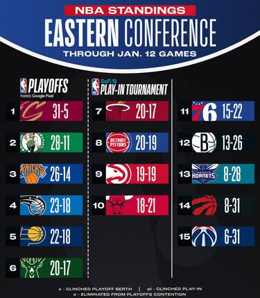 Boston recupera un po’ di terreno su Cleveland ma è comunque a 5.5 gare di distanza, mentre New York e Orlando tengono il passo. Indiana sale al quinto posto grazie alla sesta vittoria consecutiva, mentre Milwaukee viene raggiunta da Miami. Philadelphia continua a rimanere fuori dalla zona play-in, a due gare di distanza da Washington