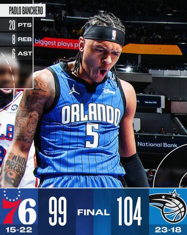 Privi di Joel Embiid per la quarta partita consecutiva, i Sixers perdono anche sul campo di Orlando nonostante i 29 punti di Tyrese Maxey e i 25 con 10 rimbalzi e 6 assist di Paul George. La panchina dei Magic infatti travolte quella degli ospiti per 48-11 guidata dai 27 punti di Cole Anthony, permettendo a Paolo Banchero di prendersi il suo tempo per entrare in partita e per chiuderla con 7 dei suoi 20 punti negli ultimi 92 secondi di gara, aggiungendo anche 8 rimbalzi e 6 assist alla sua seconda presenza dopo il lungo infortunio. Orlando si gode anche la prima doppia doppia di Jonathan Isaac (20 punti e 11 rimbalzi) dal lontano 2019