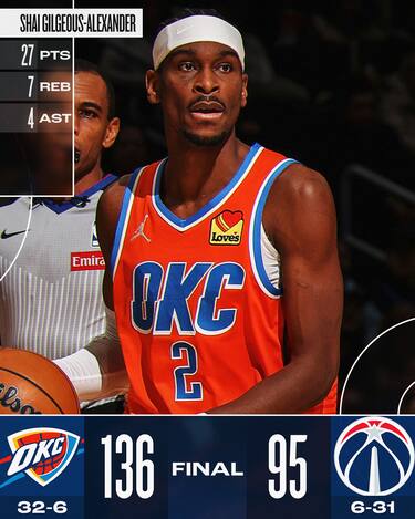 Un primo tempo da 67-43 in favore dei Thunder mette già ampiamente in chiaro quanta distanza ci sia tra le due squadre in questo momento, permettendo a Shai Gilgeous-Alexander di chiudere con 27 punti nonostante la sua peggior prestazione al tiro della stagione (5/16), sopperita però dalla capacità di andare in lunetta (16/17). Il resto del quintetto tocca la doppia cifra e dalla panchina Aaron Wiggins mette 23 punti con 9 rimbalzi, avendo facilmente ragione dei padroni di casa che non vanno oltre i 17 punti di Corey Kispert subendo il peggior scarto di questa stagione