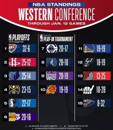 OKC ha un vantaggio sulla seconda (Houston) più grande rispetto a quello di Cleveland su Boston (6.5 gare contro 5.5 gare), mentre Denver si prende il quarto posto solitario approfittando dei problemi di Dallas. Il quarto successo nelle ultime cinque di Phoenix permette loro di tornare al 50% di vittorie e di prendersi il decimo posto ai danni di Golden State