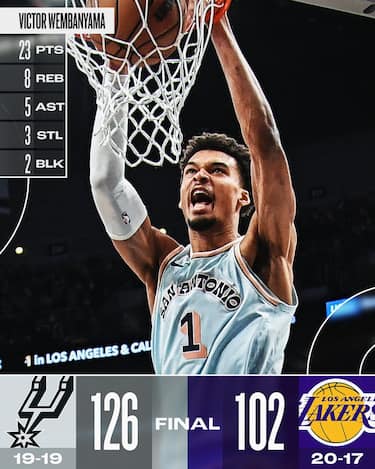 Guidati dalla loro giovane stella Victor Wembanyama, gli Spurs dominano nel secondo tempo e battono nettamente i Lakers, mentre i Clippers hanno la meglio su Miami. I Pistons non fermano la loro corsa e, trascinati da un grande Cade Cunningham, vincono a New York, ottenendo così la 10^ vittoria nelle ultime 12 partite. Ci vuole un Anthony Edwards in formato All-Star per trascinare Minnesota alla vittoria a Washington, mentre Jalen Green decide la sfida tiratissima tra Houston e Memphis. Brutta sconfitta per Golden State, che perde anche a Toronto e conferma una crisi ormai palese. Tutti i risultati e gli highlights della notte NBA