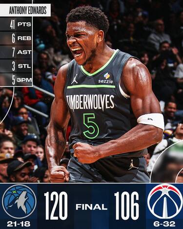 L’andamento della gara dei T’Wolves a Washington segue quello della sua stella, che gira a vuoto senza incidere per buona parte della partita. Nel 4° quarto, però, Anthony Edwards comincia a entrare nel ritmo giusto e segna 20 dei suoi 41 punti finali, a cui aggiunge anche 7 assist e 6 rimbalzi tirando con un eccellente 14/25 dal campo e 5/11 da tre