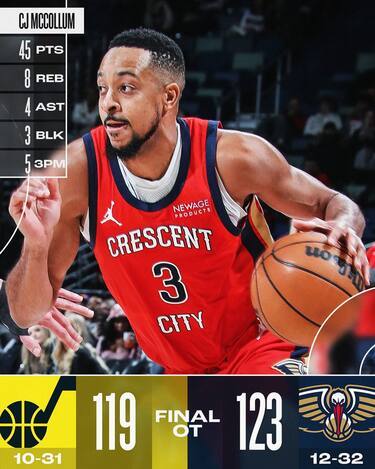 Come già successo nelle poche serate positive vissute dai Pelicans in questa stagione, il grande protagonista contro Utahè CJ McCollum. Il veterano trascina i suoi alla vittoria con una super prestazione da 45 punti a cui aggiunge anche 8 rimbalzi e 4 assist, riuscendo a piazzare poi le giocate decisive che indirizzano la gara nel supplementare