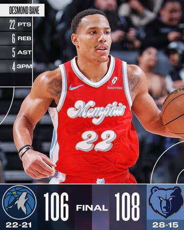 Dopo essere stati sotto a lungo, i Grizzlies riescono a ribaltare la sfida contro Minnesota negli ultimi minuti e vincono in volata sulla tripla sbagliata da Anthony Edwards al suono della sirena finale. Memphis costruisce la sua rimonta e quindi il sorpasso sulle spalle di Jaren Jackson Jr. (24 punti e 10 rimbalzi) e Desmond Bane (22 punti con 4/6 da tre), mentre ai T’Wolves non basta un’altra prova eccellente di Naz Reid, che in uscita dalla panchina chiude con 29 punti