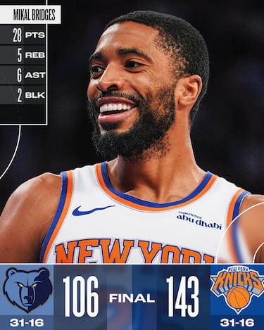 La striscia di sei vittorie in fila dei Grizzlies si interrompe bruscamente al Madison Square Garden, dove i Knicks per la seconda volta in fila superano quota 140 punti segnati (non accadeva da 45 anni in partite finite nei regolamentari). Il quarto successo consecutivo di New York vede tre giocatori raggiungere quota 20 (28 per Bridges, 24 per Towns e 20 per Brunson) e altri quattro andare in doppia cifra, mentre in casa Grizzlies non si va oltre ai 21 punti di Jaren Jackson Jr. e i 16 di Desmond Bane, con Ja Morant silente a quota 10 punti con 5/13 al tiro e -41 di plus-minus in una serata da 26 palle perse di squadra