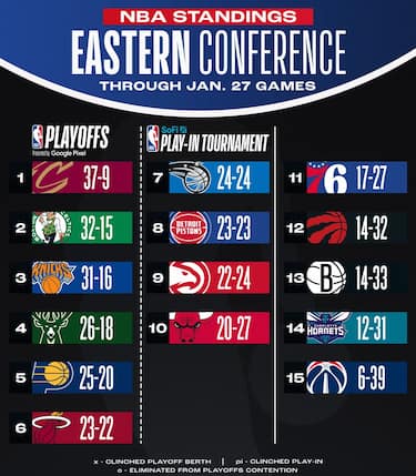 Cleveland torna ad allungare su Boston, che ora deve guardarsi le spalle da New York tornata a una sola gara di distanza. Miami risale al sesto posto scavalcando proprio Orlando sconfitta nel derby, il quinto ko in fila di Atlanta non mette in discussione più di tanto il suo posto al play-in. Sette sconfitte in fila per Brooklyn, comunque la metà rispetto alle 14 di Washington