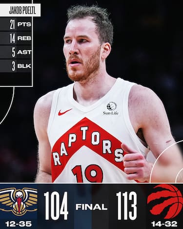Erano quasi due anni che i Raptors non riuscivano a mettere assieme una striscia di quattro vittorie consecutive: i 21 punti con 14 rimbalzi di Jakob Poeltl e i 21+11 di Scottie Barnes spingono i canadesi al successo sui Pelicans nonostante un pessimo terzo quarto perso per 35-18. Zion Williamson infatti segna 31 punti (a -3 dal suo massimo stagionale) e CJ McCollum ne aggiunge 22 per permettere ai Pelicans di tornare a contatto, ma un ultimo quarto da 39-29 da parte dei padroni di casa permette ai Raptors di vincere la partita