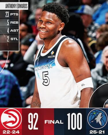 I T’Wolves non vanno mai sotto per tutta la partita e superano gli Hawks ridotti ai minimi termini, privi di Trae Young, Dyson Daniels e Jalen Johnson. Anthony Edwards segna 23 punti e Julius Randle ne mette 20 insieme alla doppia doppia da 18+10 di Rudy Gobert, tenendo gli avversari a soli 18 punti nel quarto periodo e proteggendo così un vantaggio che all’intervallo era comodamente di 17 lunghezze