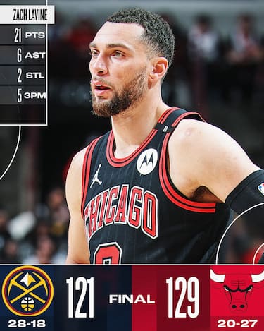 Seconda sconfitta in fila per i Nuggets, che dopo aver perso a Minneapolis concedono il bis anche a Chicago. I 21 punti di Zach LaVine e i 20+10 di Nikola Vucevic guidano i Bulls solamente alla seconda vittoria nelle ultime nove partite, in una serata in cui a farla da padrone è il tiro da tre punti. I Bulls infatti tirano 24/53, spaccando in due la partita con un parziale di 13-0 per cominciare il quarto periodo e non voltandosi più indietro, grazie anche ai 41 punti dalla panchina contro i soli 10 dei Nuggets