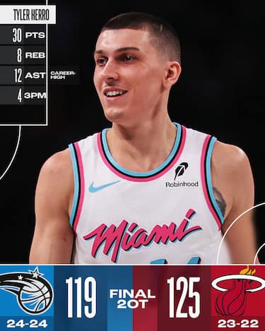 Nonostante tutte le distrazioni dell’affaire Butler, sospeso a tempo indeterminato dalla franchigia, gli Heat vincono in rimonta il derby della Florida dopo due tempi supplementari ringraziando i 30 punti di Tyler Herro. I padroni di casa recuperano 12 punti di svantaggio a metà quarto periodo grazie a un parziale di 15-3, piegando definitivamente i Magic in un secondo overtime vinto per 9-3 contro i rivali della Florida. I 29 punti di Franz Wagner e i 17 a testa di Paolo Banchero e Tristan Da Silva non bastano ai Magic per rispondere a un Herro formato All-Star Game (anche 8 rimbalzi e 12 assist) e alla tripla doppia sfiorata da Bam Adebayo (26 punti, 10 rimbalzi e 9 assist), oltre all’ottima prova del rookie Kel’el Ware (19+10)