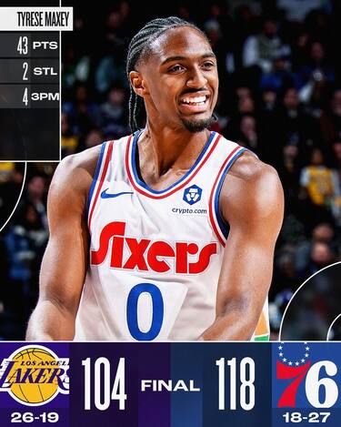 Ancora senza Joel Embiid e costretti a rinunciare anche a Paul George, i Sixers trovano un super Tyrese Maxey da 43 punti che trascina i suoi alla vittoria sui Lakers, che perdono Anthony Davis per infortunio dopo pochi minuti e a cui non basta il solito LeBron James da 31 punti. Jalen Green e i Rockets piazzano il colpo in trasferta nel recupero della partita contro Atlanta rimandata per la tempesta di neve che aveva colpito la città. Nonostante un Giannis Antetokounmpo da 39 punti e 12 rimbalzi i Bucks crollano a sorpresa a Portland, mentre senza Steph Curry e Draymond Green gli Warriors riescono comunque ad avere la meglio su Utah. Tutti i risultati e gli highlights della notte NBA
