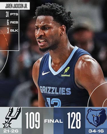 Memphis si gode il ritorno in campo di Ja Morant (25 punti e 11 assist) e l’ottimo momento di Jaren Jackson Jr., migliore in campo con 31 punti e 6 rimbalzi, e grazie anche ai 27 punti in uscita dalla panchina di un attivissimo GG Jackson batte nettamente San Antonio. Agli Spurs non basta un Victor Wembanyama da 27 punti, 10 rimbalzi e 5 assist, perché gli ospiti finiscono per pagare il 33.3% al tiro dalla lunga distanza e soprattutto le 23 palle perse totali, senza mai riuscire davvero a infastidire i Grizzlies