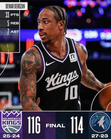 In attesa di trovare nuovi equilibri con il cambio tra Fox e LaVine nel backcourt, i Kings passano a Minneapolis poggiandosi su quello che al momento rimane il loro punto fermo in attacco, DeMar DeRozan. L’ex Spurs e Bullschiude con 33 punti, 7 assist e 5 rimbalzi, segnando i canestri che nel finale ricacciano indietro i tentativi di rimonta deiT’Wolves