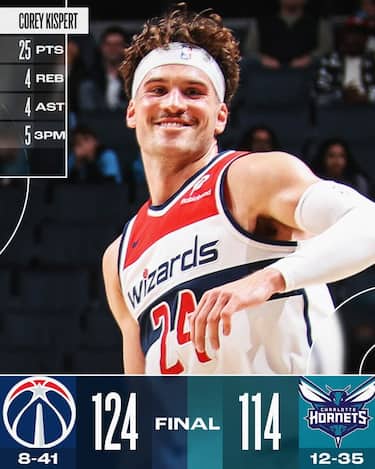 Senza le loro stelle LaMelo Ball e Brandon Miller, gli Hornets affrontano Washington e trovano la prima tripla doppia nella carriera di Miles Bridges (24 punti, 10 rimbalzi e 10 assist) e 23 punti e 14 rimbalzi da Mark Williams, ma non basta per battere gli Wizards. Gli ospiti, infatti, danno l’accelerata decisiva già nel 2° quarto e strappano la vittoria in trasferta sulle ali di Bilal Coulibaly (26 punti) e di Corey Kispert, che entra dalla panchina e segna 25 punti tirando 5/9 dalla lunga distanza