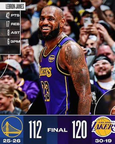 Che quella contro Golden State non sia una partita qualunque per lui lo si capisce già dal primo tempo, quando LeBron James mette subito in chiaro le sue intenzioni e segna 23 punti. Nonostante il vantaggio accumulato dai suoi, gli Warriors si rifanno sotto e allora per mettere il sigillo sulla vittoria dei Lakers occorre ancora una sua tripla presa in faccia a Buddy Hield con 1:08 da giocare e che chiude una prestazione mostruosa da 42 punti, 17 rimbalzi, 8 assist e 14/25 dal campo