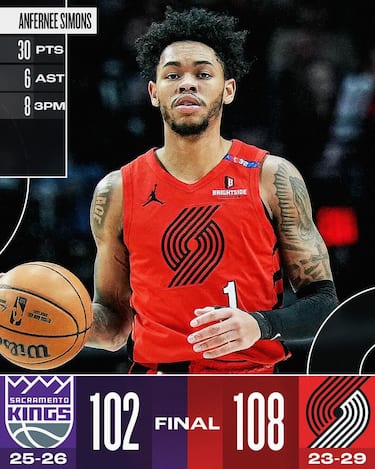 Non si ferma la corsa dei Blazers, davvero la sorpresa di questo momento della stagione, che battono anche Sacramentoe trovano conferme importanti dal loro nucleo giovane. Sono infatti Anfernee Simons, autore di 30 punti tirando 9/16 dal campo, e Shaedon Sharpe, che entra dalla panchina e chiude con 24 punti, i protagonisti principali della vittoria di Portland. Discreta prova per Zach LaVine (22 punti e 8/19 al tiro), mentre ai Kings non basta nemmeno l’esordio dell’ultimo acquisto Jonas Valanciunas, autore di 6 punti e 5 rimbalzi in 17 minuti entrando dalla panchina