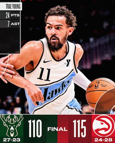 Partita a dir poco rapdosica tra Hawks e Bucks: dopo essere andati sopra di 12 lunghezze, gli Hawks subiscono un parziale di 47-14 da parte degli ospiti per finire sotto di 21, ma da lì in poi mettono assieme un contro-parziale di 37-14 e chiudono poi i conti nel quarto periodo, interrompendo così una striscia di cinque sconfitte in fila. I 24 punti di Trae Young e i 15 a testa di Mouhamed Gueye e Dyson Daniels sono cruciali per superare i 26+15 di Bobby Portis e i 23 con 9 rimbalzi e 10 assist di Damian Lillard, con i Bucks privi di Antetokounmpo sconfitti per la quinta volta nelle ultime sei partite