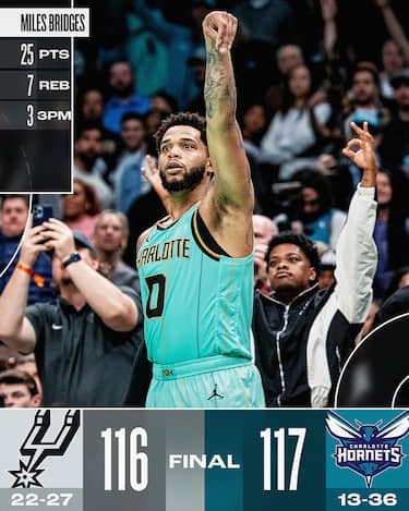La partita più divertente della notte è quella tra Hornets e Spurs, risolta solamente negli ultimissimi secondi. Un canestro da tre punti di Miles Bridges (miglior realizzatore dei suoi a quota 25 punti) dà agli Hornets il vantaggio a 1.4 secondi dalla fine, ma De’Aaron Fox segna da tre punti per quello che inizialmente sembra il primo buzzer beater della sua carriera in maglia Spurs. Riguardando al replay però il pallone è ancora nelle mani del nuovo arrivato in casa Spurs quando suona la sirena: la sua prodezza viene così annullata e Charlotte può interrompere una striscia di 6 sconfitte in fila, grazie anche ai 24 punti e 10 assist del rientrante LaMelo Ball