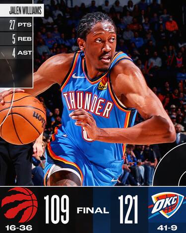 I Thunder festeggiano il ritorno in campo di Chet Holmgren (4 punti, 5 rimbalzi e 4 stoppate) con la quarta vittoria consecutiva, merito dei 27 punti di Jalen Williams e dei 25 di Shai Gilgeous-Alexnader senza mai andare sotto nella ripresa e toccando anche il +22. Privi di RJ Barrett e del nuovo arrivato Brandon Ingram, i Raptors non vanno oltre i 21 punti di Scottie Barnes subendo la terza sconfitta in fila andando in grossa difficoltà contro le braccia dei Thunder, segnando appena 20 dei 50 tiri da due punti tentati