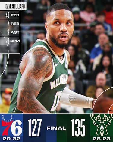 Senza Antetokounmpo, ci pensa Lillard a trascinare i Bucks con 43 punti, 8 assist e 8 triple vincendo anche il duello diretto con uno scatenato Maxey da 39 punti. Houston supera Toronto grazie al parziale decisivo nel quarto quarto, e torna al successo dopo sei sconfitte consecutive, mentre Detroit prima domina e poi si complica la vita contro Charlotte, ma la spunta grazie alla tripla doppia del suo All-Star Cade Cunningham