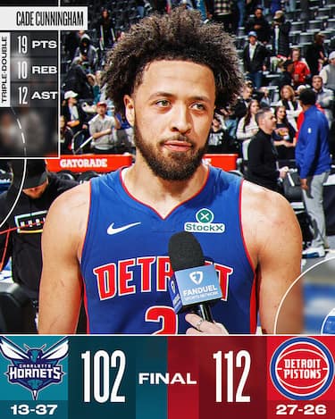 È un All-Star e lo dimostra ogni volta che scende in campo: Cade Cunningham guida i suoi alla vittoria con l’ottava tripla doppia del suo campionato. Sono 19 i suoi punti, con 12 assist e 10 rimbalzi, anche se il top scorer dei Pistons è un Tobias Harris da 20 punti con 9/13 al tiro mentre quello della partita è Miles Bridges, che ne segna 30 ma non evita a Charlotte il 7° ko nelle ultime 8 gare disputate. Tre rimbalzi ma 0/3 al tiro e 0 punti per Fontecchio