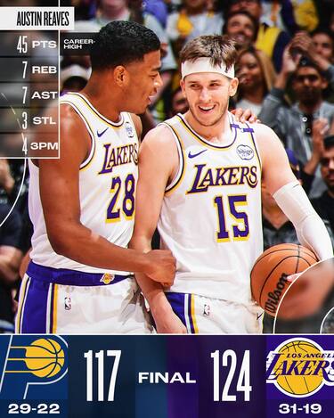 Se le telecamere vanno tutte su LeBron e Doncic in panchina, la Crypto.com Arena non può fare altro che applaudire una prestazione sensazionale di Austin Reaves. Il numero 15 gialloviola si carica la squadra sulle spalle e ritocca il suo massimo in carriera a quota 45 punti, frutto di un eccezionale 14/26 al tiro con 4/9 dalla lunga distanza e 13/13 ai liberi, accompagnato dai 24 punti di Rui Hachimura. Con questo successo — il 9° nelle ultime 10 partite — i Lakers salgono al quarto posto in classifica a Ovest, scavalcando Houston
