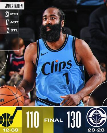 Vittoria meno semplice del previsto per i Clippers, che prendono il largo solo nel 4° quarto e battono Utah grazie alle ottime prestazioni di Ivica Zubac (26 punti e 15 rimbalzi), Norman Powell (26 punti) e James Harden (23 punti e 17 assist). I Jazz, invece, trovano 24 punti da Jordan Clarkson e 21 in uscita dalla panchina da Keyonte George e riescono così a restare a lungo in partita, cedendo il passo solo quando i padroni di casa cambiano marcia