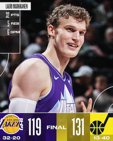 In una serata in cui tutti attendono di poter osservare la seconda uscita della coppia Doncic-James, a prendersi il palcoscenico è Lauri Markkanen. Il finlandese è il trascinatore dei Jazz e sono i suoi 32 punti, arrivati tirando 6/10 dalla lunga distanza, a punire puntualmente la difesa troppo pigra dei Lakers