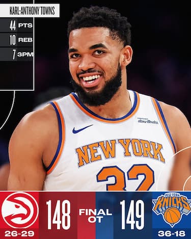 Anche contro Atlanta Karl-Anthony Towns conferma il suo grande momento di forma piazzando una mostruosa doppia doppia da 44 punti e 10 rimbalzi, ma il centro dei Knicks è soprattutto decisivo al tiro dalla lunga distanza, dove chiude con un eccellente 7/10